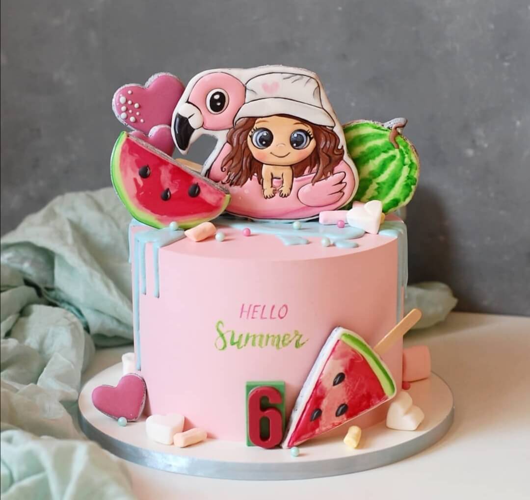 Летний детский тортик с арбузиками и очаровательным малышом на воздушном круге