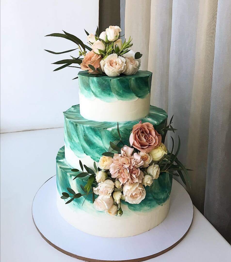 Цветочно-малахитовое украшение торта отлично впишется в светлое оформление свадьбы