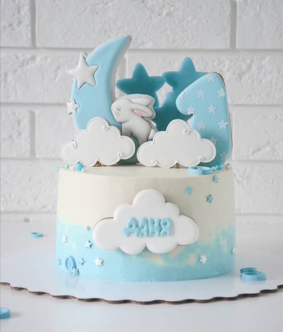 Нежнейший и трогательный тортик с изображением маленького кролика, спящего в облачках - совсем как маленький виновник торжества!